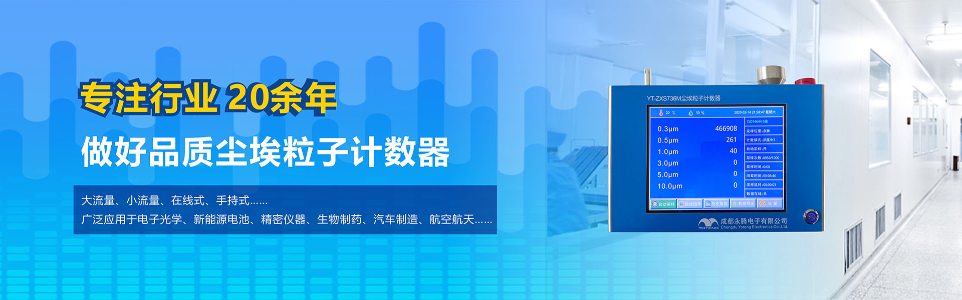 成都永騰電子有限公司位于成都市國家經(jīng)濟技術(shù)開發(fā)區(qū),是一家專業(yè)從事環(huán)境空氣監(jiān)測儀器研發(fā)、生產(chǎn)、銷售于一體的高科技企業(yè)。產(chǎn)品涵蓋空氣檢測儀器、潔凈間在線塵埃粒子計數(shù)器監(jiān)測系統(tǒng)、大氣顆粒物監(jiān)測微站系統(tǒng)、電化學(xué)分析儀器、實驗室設(shè)備等產(chǎn)品。